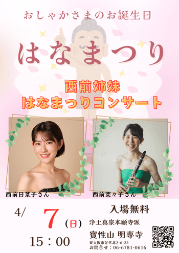 今回は西前姉妹のコンサートを行います。ビンゴゲームやほとけさまのお話など盛りだくさん(*´з`)無料ですので、どなたさまもお参りして下さい(^^)