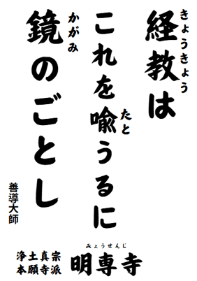 経教とはお経のことで、「お経は鏡のようである。」と記されています。つまり、お経の教えは自分の心を映し出す鏡であると・・・。お経とはお釈迦様が私たちに説いて下さった真実の教え、いうなれば、現代の私たち対してのメッセージです。